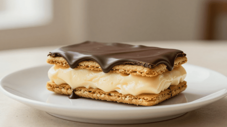 Dieses Dessert ohne Backen interpretiert das traditionelle französische Éclair in einer vereinfachten, aber ebenso köstlichen Version neu. Mit seinen Schichten aus Graham-Crackern, die in Vanillepudding getränkt sind, und seiner Schokoladenglasur gibt es die Essenz der Pariser Konditorei wieder. Die Magie geschieht, wenn sich die Kekse in eine schmelzende Kuchentextur verwandeln.