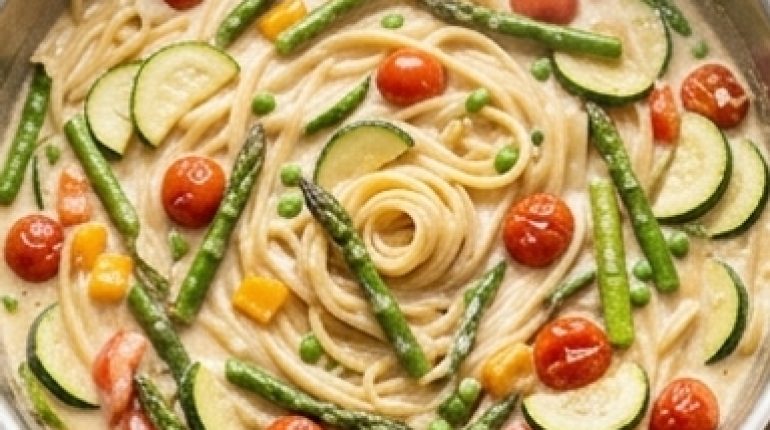 Dieses Geräusch — die Butter, die beim Auftreffen auf die heiße Pfanne brutzelt, bevor der Knoblauch dazukommt — das ist das Signal. Ein Samstagmittag, keine Eile, das Gemüse wartet brav auf der Arbeitsplatte. Cremige Pasta Primavera ist genau diese Art von Gericht.