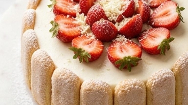Erdbeer-Charlotte mit weißer Schokolade ist das Dessert, von dem jeder denkt, es sei nur den Profi-Hobbybäckern vorbehalten — zu elegant, zu technisch, zu viele Fehlermöglichkeiten. In Wirklichkeit: kein Backofen, keine Konditorcreme, auf die man aufpassen muss, keine Butter, die man temperieren muss. Nur Schichten, eine Nacht im Kühlschrank, und fertig.