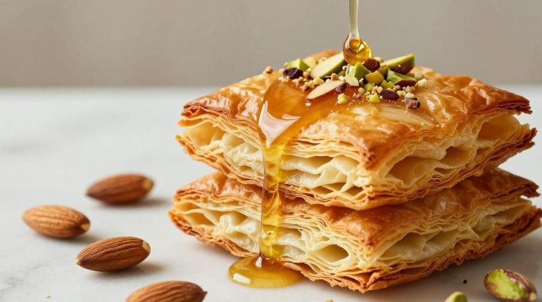 Diese Millefeuilles aus Brickteig mit Trockenfrüchten beweisen, dass ein Gourmet-Dessert keine Stunden in der Küche erfordert. Inspiriert von den Aromen Nordafrikas verbinden sie die goldene Knusprigkeit des Brickteigs mit schmelzendem Honig und knackigen Mandel- und Pistaziensplittern. Ein Express-Rezept, das einfache Zutaten in eine raffinierte Patisserie verwandelt.