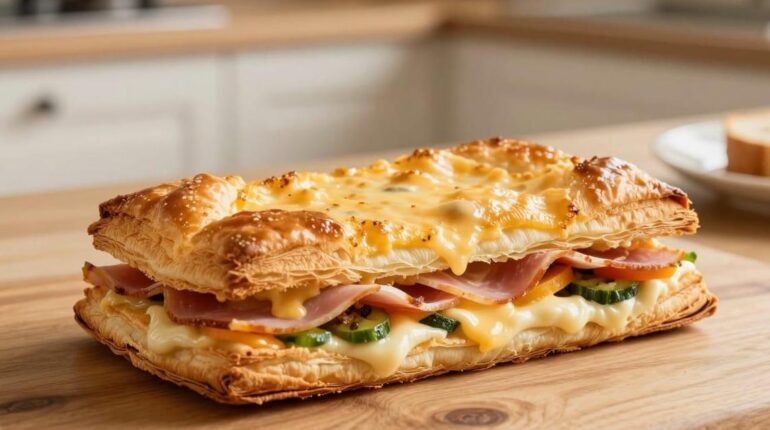 Ein Familien-Blätterteiggebäck mit nur 6 Zutaten, das seit Jahren alle begeistert. Dieses einfache Rezept auf Basis von Blätterteig, Schinken, Käse und etwas Gemüse ist zu einem wöchentlichen Muss geworden. Entdecken Sie, wie Sie diese alltäglichen Zutaten in ein Gericht verwandeln, nach dem Groß und Klein immer wieder verlangen.