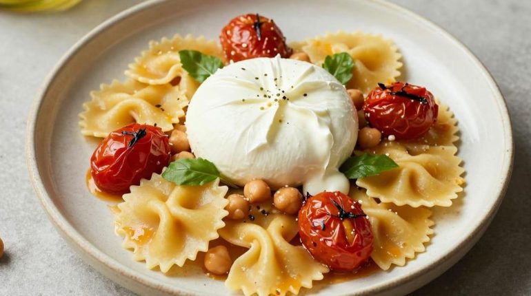 Farfalle mit gerösteten Tomaten und würzigen Kichererbsen präsentieren sich als vollwertiges Gericht, das Genuss und Ernährungsbilanz in Einklang bringt. Dieses mediterrane Rezept setzt auf die Einfachheit des Backens im Ofen und die perfekte Verbindung zwischen knusprigen Hülsenfrüchten und kandierten Tomaten. Das Ganze wird durch eine cremige Burrata veredelt, die dieses vegetarische Gericht in ein echtes kulinarisches Erlebnis verwandelt.