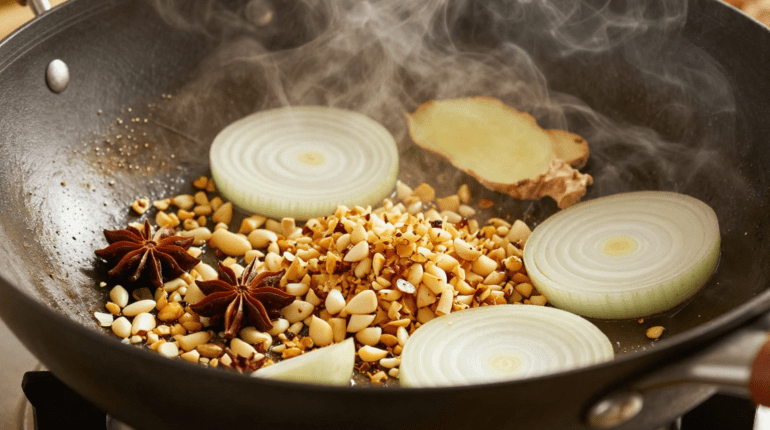 In einer trocken erhitzten Pfanne werden zerdrückter Knoblauch, Zwiebeln…