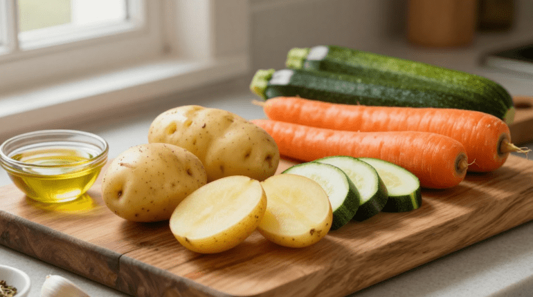 Im Ofen geröstetes Gemüse ist die ideale Beilage, um Ihre täglichen Mahlzeiten mühelos zu veredeln. Dieses Rezept kombiniert neue Kartoffeln, Karotten, Zucchini und eine mediterrane Gewürzmischung zu einem schmackhaften und vielseitigen Gericht. Entdecken Sie, wie ein paar einfache Zutaten Ihre gewöhnlichen Beilagen in einen echten kulinarischen Genuss verwandeln können.
