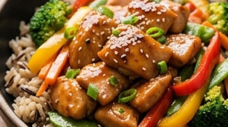 📌 Glasierte Teriyaki-Hähnchenpfanne, knackiges Gemüse und Wildreis