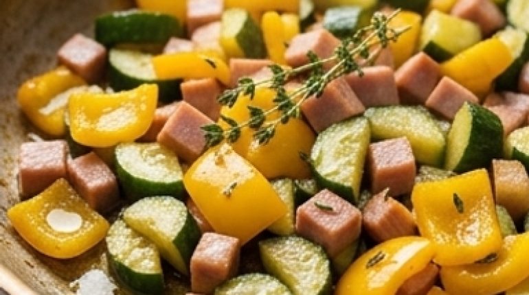 Dies ist die Art von Rezept, die an einem Dienstagabend entsteht, wenn der Kühlschrank am Ende des Sommers wie eine Brachfläche aussieht. Eine vergessene Gurke, eine etwas weiche Paprika, zwei Scheiben Putenschinken – und in zwanzig Minuten steht ein warmes Gericht auf dem Tisch. Ohne Schnickschnack.