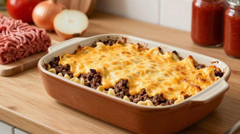 Hackfleisch-Auflauf: ein Wohlfühlgericht, das Hackfleisch, Eiernudeln und schmelzenden Käse vereint. Dieses herzhafte Rezept kombiniert einfache Zutaten – Rindfleisch, Tomatensauce, saure Sahne und Cheddar – zu einem schmackhaften Familiengratin. Eine unkomplizierte Zubereitung, die Vorratsklassiker in eine vollständige Mahlzeit verwandelt, die jedem schmeckt.