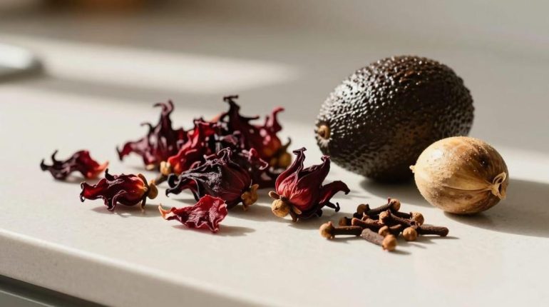 Eine Handvoll getrocknete Hibiskusblüten, acht Nelken…