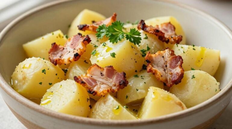 Kartoffelsalat erfindet sich neu dank einer überraschenden Zutat, die dieses Familiengericht in eine Gourmet-Kreation verwandelt. Geräucherte Putenwürfel, goldbraun und knusprig gebraten, sorgen für eine unwiderstehliche Textur und einen markanten Kontrast zur Zartheit der Kartoffeln. Eine warme Knoblauch-Vinaigrette vervollständigt dieses wohltuende Rezept, das Klassiker intelligent neu interpretiert.