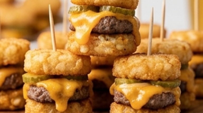 Man sieht „Tater Tots“ und „Mini-Cheeseburger“ im selben Titel und denkt sofort an Schulkantine, Plastiktabletts und langweiliges Zeug. Es ist genau das Gegenteil. Diese Häppchen haben eine Textur, die nur wenige Snacks erreichen: der klare Knall des Tots unter dem Zahn, dann das Zarte des Steaks, dann der Cheddar-Faden, der eine Sekunde lang Widerstand leistet, bevor er nachgibt. Man isst es in einem Bissen. Und niemand hört nach einem auf.