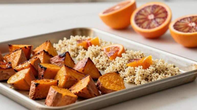 📌 Quinoa und geröstete Süßkartoffeln: Die Kombination aus Blutorange und Feta, die diese Bowl in ein ausgewogenes Gericht verwandelt