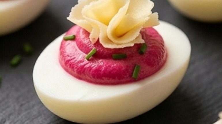 Das Zischen des Wassers, wenn die Temperatur steigt. Damit fängt alles an. Genau neun Minuten, und man erhält Eigelbe, die in der Mitte noch leicht cremig sind – genau die, die sich mit der Roten Bete vermischen, um diese fast unwirklich rosa Füllung zu ergeben, glänzend wie ein Bonbon. Ein Ei Mimosa, das alles andere als gewöhnlich ist.