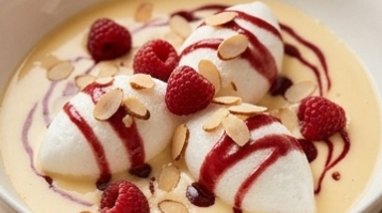 Dies ist die Art von Dessert, die man an einem Sonntagabend serviert, wenn man jemandem eine Freude machen möchte, ohne zwei Stunden in der Küche zu stehen. Île flottante (Schwimmende Insel) kennt jeder. Aber mit einem Himbeeressig-Karamell anstelle des klassischen Karamells wird es zu etwas ganz Besonderem.