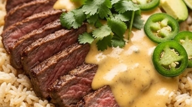 📌 Steak, Reis und cremige Queso-Sauce
