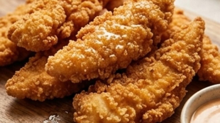 • Hähnchenbrust — Nimm dicke Filets, keine dünnen Schnitzel, die in zwei Sekunden austrocknen. Schneide sie selbst in 2 cm breite Streifen — diese Dicke sorgt dafür, dass das Fleisch gar wird, während die Panade bräunt. Zu dünn gart es, bevor es Farbe annimmt. Zu dick ist das Gegenteil.