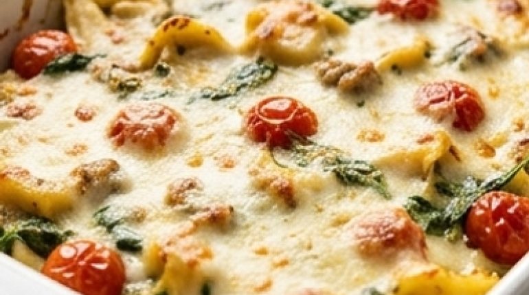 📌 Tortellini-Auflauf mit Pesto, Hähnchenwurst und geschmolzenem Mozzarella