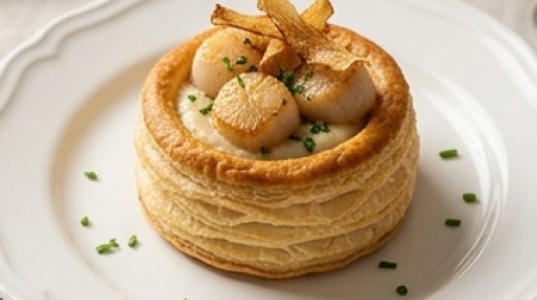 📌 Vol-au-vent mit Jakobsmuscheln, Topinambur und Schwarzwurzel-Chips