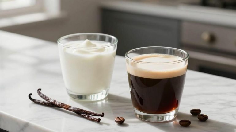 Die zweifarbige Panna Cotta besticht ebenso durch ihre Ästhetik wie durch ihren Genuss. Dieses Rezept verwandelt ein klassisches Dessert in eine spektakuläre Kreation dank eines einfachen Tricks: das Schrägstellen der Gläser während des Gelierens. Durch den Wechsel zwischen einer Schicht aus Naturjoghurt und einer Kaffeeschicht erzielen Sie einen verblüffenden visuellen Effekt, der Ihre Gäste beeindrucken wird.
